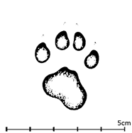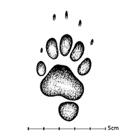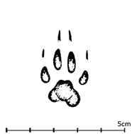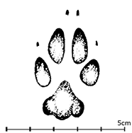 Padded (4 or 5 toes and one base with 2 lobes) with claw marks visible